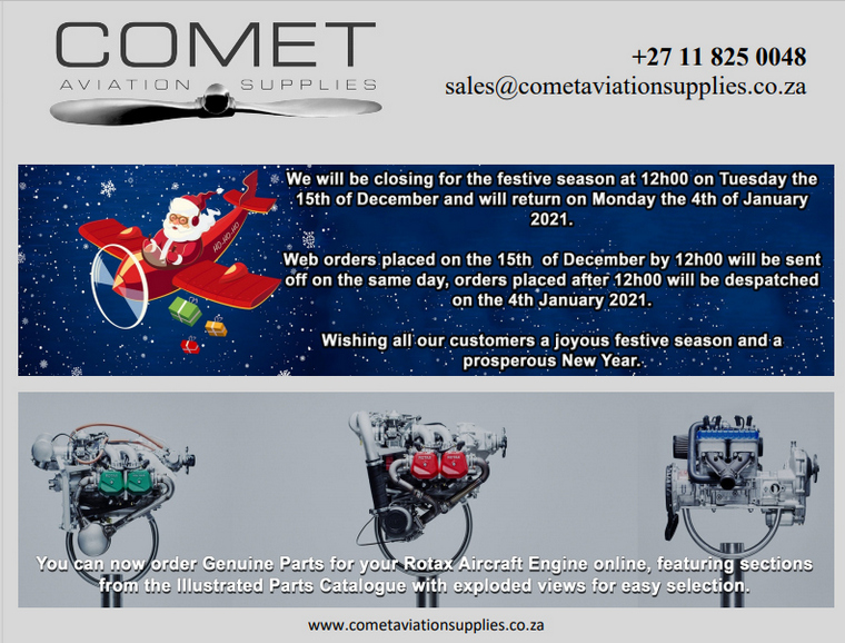 MIDWEEK UPDATE 25 NOVEMBER 2020![]() ![]() ![]() ![]() ![]() COVID 19 REGULATIONS, INITIATIVES AND AEROCLUB NEWS ![]() THE PERFECT GIFT - THE AERO CLUB CENTENARY YEARBOOK IS NOW AVAILABLE ![]() The Aero Club, as part of its Centenary, had planned for a Centenary Year Book to be released in 2020, as part of the wider celebration plan. The book has now been completed covering a rich 460-page (with around 1800 illustrations) compendium of Recreational Aviation in SA through the last 100 years, under the expert guidance of John Illsey as the editor, with input from our membership from all our sections. The books are now available and printed in Novalite (Leather), Hard Cover & Soft Cover versions, from the Aero Club Website Shop, or from the Aero Club office. Delivery Options are collection at the Rand Airport Aero Club office, or door to door courier service anywhere in SA. Courier costs will range between R 100 to R 150 per book, dependent on location. Volume purchases are also available should this be required. Pricing: - Novalite (Leather) Bound Book - R 500 - Hard Cover Book - R 400 - Soft Cover Book - R 300 https://www.aeroclub.org.za/shop/ ![]() THE CHOCK NORRIS AVIATION THEMED PHOTO CONTEST Great news! Entries to the Pilot's Post Chock Norris photo competition will open on the 22nd of November 2020 ![]() How to Enter: Entering your aviation related photo is easy and simple. All images must be emailed to pilotspost@gmail.com with the following detail included: Your name, Email address, Telephone number, Where the photo was taken, Phone used, A theme name of the photo (Optional). Due to the large amount of entries we expect, Pilot's Post will not acknowledge your entry!! Entry Rules: 1. When entering the competition and by sending your photo to Pilot's Post, you explicitly grant the publication of your submitted photograph at Pilot's Post team's discretion without any remuneration or obligation to you. 2. Submitted photos must be resized to be less than 1 megabyte in size. If full-size photographs are required, the Pilot's Post team will request them from you. 3. Only photos taken with cell phones will be accepted. 3. All submissions must have an aviation theme. 4. Photo submissions may be cropped and / or resized only. Any other form of photo alteration or manipulation is not allowed and will be disqualified. 5. You may submit up too three entries per week. Judging: 1. The Pilot's Post team will select the 2 best photos submitted every week and add them into our "Midweek Update" published every Thursday morning, where our readers will then cast their votes by simply clicking the link below the photo of their choice. 2. At the end of each month, a complete article will be published on Pilot's Post to include the weekly photo submissions with the most reader votes. Our readers will then again have the opportunity to cast their votes by simply clicking the link below the photo of their choice. The photo with the highest number of votes will then be judged the Winner of the Month. 3. A prize of a set of Chock Norris personalised Aircraft Chocks with leather storage bag valued at R500 and A voucher from the Pilot Shop valued at R200.00 will be awarded to each monthly winner. Eligibility: The Pilot's Post "Chock Norris 2020" aviation related photo competition is open only to photographer's resident in South Africa as our prizes are not transferable and can only be redeemed in South Africa.
