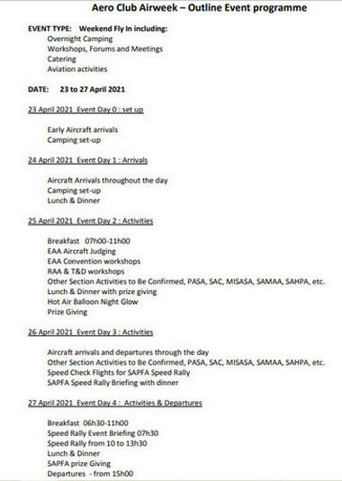 | MIDWEEK UPDATE 4 MARCH 2021    COVID 19 REGULATIONS, INITIATIVES AND AEROCLUB NEWS THE AERO CLUB CENTENARY AND AIRWEEK IS NOW PLANNED FOR 23 - 27 APRIL 2021 A draft programme is set out as per below which will be expanded as and when I know more about what each discipline would like to do: - this will be communicated as we get further information. Also attached is the poster and logos that you can use in your own media platforms and websites.    Also see below a proposed airfield layout. There is also a large camping area that Middelburg created for 2019 and members can take good advantage of this. We are working with a supplier to provide tents and will be sending out a booking form and an event attendance form shortly via our mailchimp platform, along with a link on our website. Updates to this layout will be kept current and on the Aero Club website in due course.       Best Regards Rob Jonkers Chairman rob@aeroclub.org.za T: +27 (0) 12 662 5035 F: +27 (0) 12 662 5198  REMINDER OF THE UPCOMING 80TH AERO CLUB ANNUAL GENERAL MEETING Date: 16 March 2021 Time: 18:00 for 18:30 Place: Virtual Meeting (Zoom) www.aerosud.zoom.us/j/91041663050?pwd=Z3dMUStNR2VsQ0JzVFNiYjBOMVg5Zz09  ATF renewal delays. The main topic of discussion revolved around the continuous delays in ATF Renewals, and as last reported in the Aero Club Dec Communique, the CAA advertised that their backlog would be up to date by 10 Dec. Sadly this did not happen as when the year started, the turnaround times regressed and we continue to see delays beyond their stated 20 days, mainly due to CAA internal approval cycles, which is being addressed. We continue to advocate strongly to the CAA to support renewals within their SLA turnaround times - given the risk that owners will go and fly on the strength of a payment advice. The Aero Club continues to work closely with the CAA to deal with overdue ATFs, and also to note delays in Inspector allocations, which is supposed to be within 5 days. If any member is having difficulties in their renewals, please contact the Aero Club for us to escalate it. ATF Documentation. There is further an initiative to review the ATF documentation requirements, anniversary dates and regulatory anomalies found in two General Notices issued in Oct 2019, which will be gaining traction with discussions with the CAA for a regulatory update. This should go some way to alleviate current frustrations on ATF submissions. Further to this, there will be a plan to constitute ATF documentation seminars to assist owners in preparing ATF renewal submissions. Digital ATFs. The plan to go fully on digital ATFs is still in progress as the CAA has essentially completed the IT and document format & security requirements: - we will be advised when this goes live. At this point digital ATFs are in any event being provided on request, in lieu of collections that take place later. Licencing. The CAA is still working on a card type licence plan, details of which will be shared with the industry soon. If you are not a member and wish to join the Aero Club and any of its Sections feel free to do so simply go to www.aeroclub.org.za   Congratulations to Steve Brown, our January winner  Contestants, please note: - multiple votes from one device will only be counted once and may led to the entry being disqualified. Vote now for February week 4 finalists  Vote for MrchW1.1 Vote for Mrch1.2 Final entries! The competition will close on 31 March 2021 How to Enter: Entering your aviation related photo is easy and simple. All images must be emailed to pilotspost@gmail.com with the following detail included: Your name, Email address, Telephone number, Where the photo was taken, Phone used, A theme name of the photo (Optional). Due to the large amount of entries we expect, Pilot's Post will not acknowledge your entry!! Entry Rules: 1. When entering the competition and by sending your photo to Pilot's Post, you explicitly grant the publication of your submitted photograph at Pilot's Post team's discretion without any remuneration or obligation to you. 2. Submitted photos must be resized to be less than 1 megabyte in size. If full-size photographs are required, the Pilot's Post team will request them from you. 3. Only photos taken with cell phones will be accepted. 3. All submissions must have an aviation theme. 4. Photo submissions may be cropped and / or resized only. Any other form of photo alteration or manipulation is not allowed and will be disqualified. 5. You may submit up to three entries per week. Judging: 1. The Pilot's Post team will select the 2 best photos submitted every week and add them into our "Midweek Update" published every Thursday morning, where our readers will then cast their votes by simply clicking the link below the photo of their choice. 2. At the end of each month, a complete article will be published on Pilot's Post to include the weekly photo submissions with the most reader votes. Our readers will then again have the opportunity to cast their votes by simply clicking the link below the photo of their choice. The photo with the highest number of votes will then be judged the Winner of the Month. 3. A prize of a set of Chock Norris personalised Aircraft Chocks with leather storage bag valued at R500 and a voucher from the Pilot Shop valued at R200.00 will be awarded to each monthly winner and a soft cover copy of the Aero Club of South Africa's Centenary Yearbook valued at R300.00 sponsored by Chapter 322 of the EAA of SA Eligibility: The Pilot's Post "Chock Norris 2020" aviation related photo competition is only open to photographers resident in South Africa as our prizes are not transferable and can only be redeemed in South Africa.  EAA CHAPTER 322 With our MACH program (Member Awards for Chapter Help), your membership could win you a trip to Oshkosh! Click on the link below today to renew or join! www.eaa.org.za/membership/membership-form or for EAA membership information go to www.eaa.org.za   The follow
