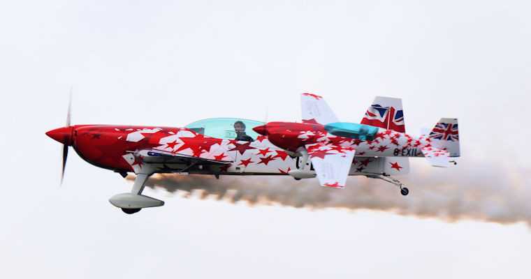 I have attended many UK air shows before and at most of them, I witnessed a remarkable duo act consisting of an Extra 300 flown by Chris Burkett and a 43% scale Extra 300 replica, remotely controlled by Mike Williams. I have never mentioned them in my reports, simply because I could never capture both in the same picture, until today. Their formation aerobatics was simply breath taking.