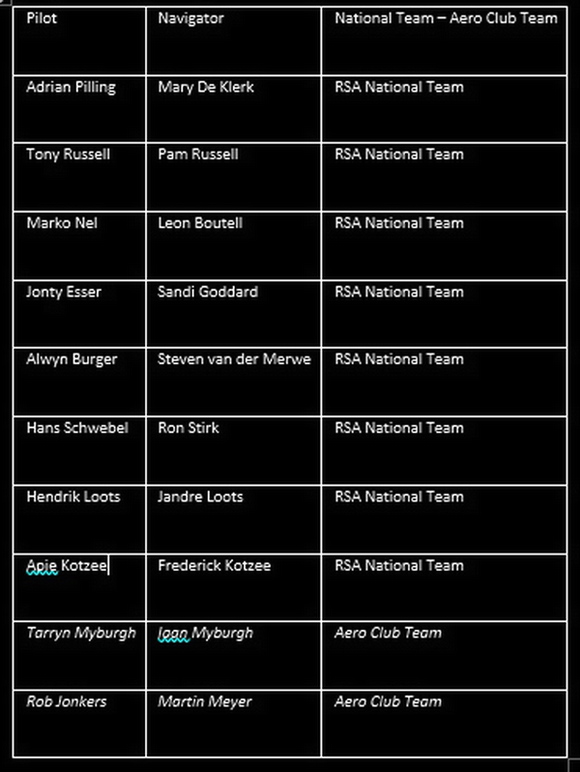 The participants were Jonty and Sandi, Tarryn and Iaan, Apie and Frederick, Adrian and Adriaan, Fanie and Herman and Hendrik. All crews flew two rounds barring myself and Sandi.