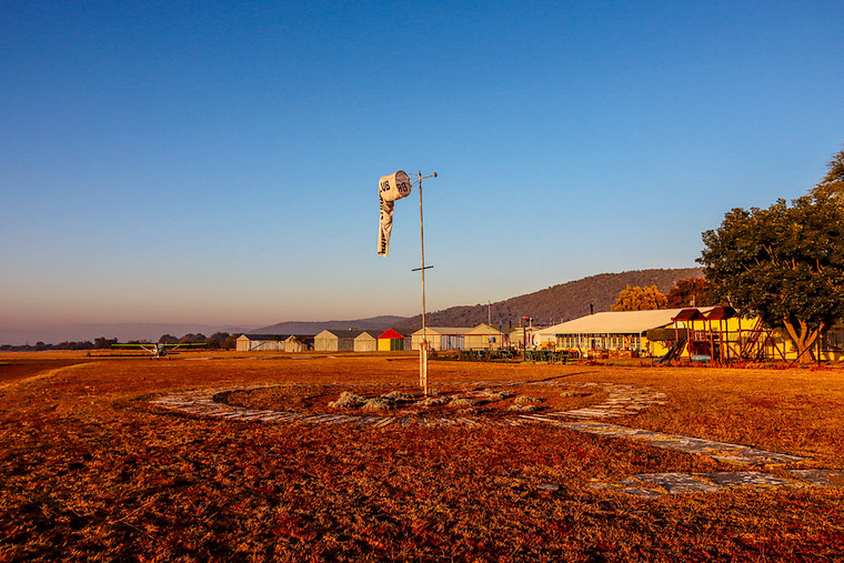 Brits Flying Clubhouse with Jonty Esser's C150, still in pajamas, and some of the hangars as the sun started to warm things up.