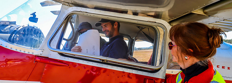Laura and Stuart McDermid receiving their envelope of instructions, with their dog comfortably accommodated behind them, taking off and landing in ZS-MJB.