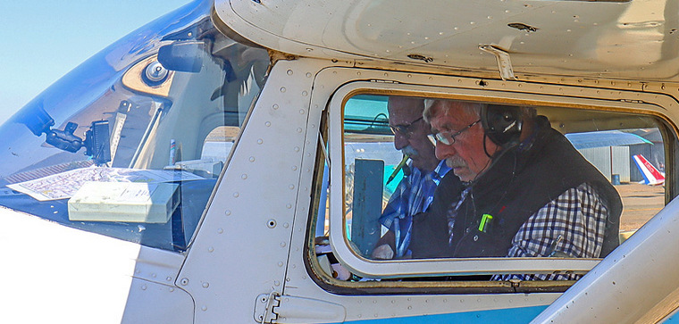 Hans Schwebel and Ron Stirk with their heads down studying their instructions, taking off and landing - last, but not least, as they shared ZS-NBT and had to wait for its return.