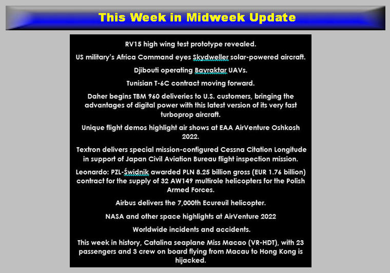 MIDWEEK UPDATE 14 JULY 2022Google Banner Ad ![]() ![]() ![]() ![]() ![]() ![]() ![]() RV15 HIGH WING TEST PROTOTYPE REVEALED Earlier this year Van's Aircraft in a somewhat cryptic news release announced that it may be working on a high wing design. More about it, it promised will be revealed at AirVenture 2022. The general aviation market is eagerly awaiting more news. ![]() A week ago, the company in a YouTube video, that gathered 7,000 views in the first few hours, unveiled its new RV-15 prototype. The company has been working on the project for some time and the aircraft in the video is the test bed for the kits that will follow. “This airplane was built to evaluate and test the design, and what we've been learning from this engineering 'tool' test airplane will result in refinements and changes that will appear in the final 'kit' aircraft design.” A spokesman for Van's stated. The AirVenture reveal is scheduled for 26 July 2022. ![]() US MILITARY'S AFRICA COMMAND EYES SKYDWELLER SOLAR-POWERED AIRCRAFT Written by defenceWeb ![]() The US military's Africa Command is supporting the development of the Skydweller solar-powered aircraft that it sees being used by the US and partners to counter destabilising, violent extremist activity in Africa. The aircraft was displayed in Spain on 14 June, when civilian and military leaders from US Africa Command, France, Luxembourg and Spain gathered at the Albacete Air Base to formalise their support of a technology demonstration of the pilotless, carbon-neutral Skydweller airframe. The aircraft should become capable of multi-month, continuous flight and has potential beyond gathering intelligence that supports US and partner-led efforts to counter destabilising, violent extremist activity in Africa, Africom said. “The bottom line is that a long duration and persistent ISR platform has the potential to provide a wide-range of capabilities to us…and our African partners at a lower cost while embracing a low carbon solution,” said Brigadier General Rose Keravuori, US Africa Command's deputy director for intelligence. The aircraft - the 10-year, old solar-powered Solar Impulse 2 - was acquired by Skydweller Aero (partly owned by Leonardo) and has been further developed and tested with US government support in Spain. Skydweller is modelled after the Solar Impulse 2 that flew around the world in 2015 and 2016 using solar power, but will be pilotless. Removing the pilot will give extra payload capability. Skydweller will be able to fly at 180 km/h, at an altitude 14 000 metres, with up to 350 kg of surveillance equipment like radar and cameras. “With long duration dwell, there is the potential for persistent monitoring of natural disasters to help provide better disaster response,” Keravuori said. “Our African partners would welcome persistent ISR (Intelligence, Surveillance and Reconnaissance) that can track piracy, receive indications of illicit trafficking, illegal oil bunkering, illegal poaching, or predator fishing.” ![]() Speaking to the potential effects of climate change in Africa and how that change drives instability that is taken advantage of by adversaries to the detriment of societies, governments and people, Keravuori said the “added capability to monitor animal movements and the spread of desertification are especially critical as we monitor the signs of climate change.” Development and implementation of the aircraft - better known for its solar-powered circumnavigation of the world in 2016 - attracted support from partner-nation dignitaries for the shared benefits of ending the aviation sector's reliance on fossil fuel and allowing armed forces to approach security in an innovative, efficient way, Africom explained. “I want to express our gratitude for the consistent and extensive support provided by our Spanish hosts,” Keravuori said. “We also want to thank the Government of Luxembourg for agreeing to transport the Skydweller prototype aircraft to an operational demo location in the Caribbean where we can learn more about its capabilities.” The aircraft's designers are working to make the Skydweller autonomous, and coupled with its tendency to perform better around the equator given weather patterns and exposure to sunlight, the Skydweller would be an ideal platform for use in Africa. Google Block Ad “Africom, along with the US Department of Defence's Research and Engineering Branch and… Southcom (US Southern Command) are pleased to assist in the development of a carbon-neutral, long-dwell surveillance platform that can assist in generating greater security and development in partner countries,” Keravuori said. “We are interested in, and look forward to, exploring opportunities to co-ordinate with the military delegations present here today from France, Luxembourg and Spain. “The bottom line is that a long duration and persistent ISR platform has the potential to provide a wide-range of capabilities to us…and our African partners at a lower cost while embracing a low carbon solution.” Solar Impulse 2 is the brainchild of Swiss explorer Bertrand Piccard and Swiss engineer Bertrand Borschberg. After its record-breaking flight around the world, it was in 2019 bought by Skydweller Aero. After months of modifications, it flew again for the first time in November 2020. Since then, it has completed a dozen test flights in Spain and is in the process of turning it into a drone. The aircraft could be deployed as early as 2023. Skydweller Aero hopes to offer the aircraft as a pseudo-satellite for commercial services, but has also received $5 million from the US Navy to investigate the aircraft's ability to perform maritime patrols. The Defence Innovation Unit, tasked with developing emerging technology for the US military, has awarded Skydweller a $14 million contract, CNN reported. ![]() ![]() Djibouti appears to have become the latest customer for Turkey's Bayraktar TB2 unmanned aerial vehicle (UAV). Two 