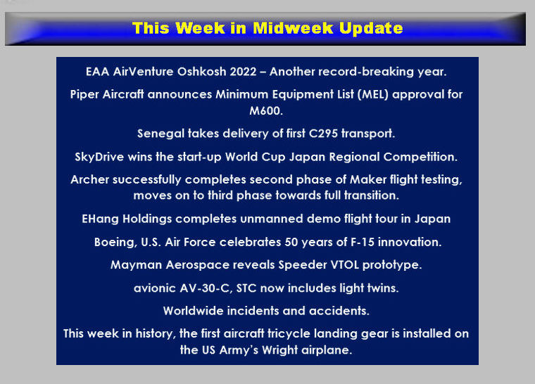 MIDWEEK UPDATE 11 AUGUST 2022Google Banner Ad ![]() ![]() ![]() ![]() ![]() ![]() ![]() ![]() ![]() ![]() ![]() ![]() Breaking the all-time record of 642,000 visitors set in 2009 with an estimated more than 650,000 entering the gates this year, EAA AirVenture Oshkosh again proved that it is the world's greatest aviation event. "We had seven days of nearly perfect weather, along with this year's programmes and activities, which brought out people and airplanes in numbers that we haven't seen before." Pelton continued. A closer look at the numbers: Attendance: Approximately 650,000 - A record total (previous mark: 642,000 in 2019) and 7 percent above 2021's attendance of 608,000. Pelton said, "There were several factors involved in the record attendance this year, in addition to the great weather. Programmes such as the 75th anniversary of the U.S. Air Force contributed to exciting aerial displays all week, and it was a joy to welcome our international visitors back in full force for the first time since 2019." Total aircraft: More than 10,000 aircraft arrived at Wittman Regional Airport in Oshkosh and other airports in east-central Wisconsin. At Wittman alone, there were 18,684 aircraft operations in the 11-day period from 21-31 July, which is an average of approximately 121 take-offs/landings per hour when the airport is open. Total show planes: 3,226 included: 1,375 registered in vintage aircraft parking, plus 1,156 homebuilt aircraft (up 6 percent over 2021), 369 warbirds (up 5 percent from 2021), 137 ultralights, 87 seaplanes, 77 aerobatic aircraft, and 25 rotorcraft. Camping: More than 12,000 sites in aircraft and drive-in camping accounted for an estimated 40,000 visitors. Volunteers: More than 5,000 contributing in excess of 250,000 hours. Commercial exhibitors: 803. Forums, Workshops, and Presentations: more than 1,400 sessions hosted throughout the week. Social Media, Internet and Mobile: more than 10.6 million people were reached by EAA's social media channels during AirVenture, with engagement of 1.1 million; more than 83,000 hours of viewing EAA video clips online also occurred during the event. International guests: International visitors returned in a big way in 2022, with attendees from 92 countries outside the U.S., just one behind the record total from 2019. The Gathering shines: The EAA Aviation Foundation's annual event to support its aviation education programmes attracted more than 1,000 people and raised more than $2 million dollars that will be focused on EAA's mission of growing participation in aviation. Media: 797 media representatives on site, from six continents. Economic impact*: $170 million for the five counties in the Oshkosh region (Winnebago, Outagamie, Fond du Lac, Calumet, and Brown). * - based on 2017 University of Wisconsin Oshkosh economic impact study. ![]() PIPER AIRCRAFT ANNOUNCES MINIMUM EQUIPMENT LIST (MEL) APPROVAL FOR M600 ![]() "The addition of an approved MEL for the M600 is a testament to the diverse mission profiles this aircraft can accommodate and an important step forward in expanding the operational capability of the airplane," stated Ron Gunnarson, Vice President of Sales, Marketing, and Customer Support at Piper Aircraft. ![]() SENEGAL TAKES DELIVERY OF FIRST C295 TRANSPORT defenceWeb Senegal has become the latest African country to receive Airbus C295 aircraft, taking delivery of the first of two transports on 28 July. Senegal's Armed Forces reported that the aircraft was received during a ceremony held in Dakar. A second C295 will arrive at the end of 2023. Minister of Armed Forces Sidiki Kaba said "These two aircraft will enable Senegal to ensure, independently, the projection and disengagement of its troops engaged in the various theatres of external operations and to meet all the transport and training needs of the internal theatre." Kaba also received Mi-17 and Mi-35 helicopters that had recently undergone major servicing. "The acquisition of the CASA 295 and the return from overhaul of the combat helicopters are expanding the Air Force fleet. The challenge of preserving potential remains to be met in the particularly demanding field of aviation." "Today is certainly historic as it marks an important turning point in the life of the armed forces, which are significantly increasing their capabilities in the context of strategic air transport," Kaba said. ![]() "A multirole tactical transport aircraft equipped with the latest generation technologies, the CASA 295, has large personnel carrying capacities. Beyond its take-off and landing performance on short runways, its versatility allows it to cover a wide spectrum of missions in air transport, air drop, and medical evacuation thanks to a configuration change capability in very short timelines." In addition to aircraft, Senegal will take delivery of eight LG1 105 mm howitzers from France's Nexter, and is receiving around 5 000 M4A1 rifles from the United States to replace the country's M16A1 assault rifles. The latest tranche of rifles arrived in Dakar in January this year. The equipment acquisition is part of President Macky Sall's Emerging Senegal Plan that aims to enhance the country's armed forces. Impending deliveries include three OPV 58S offshore patrol vessels from Piriou, while in June, Senegal's armed forces received Puma M36 armoured personnel carriers from South Africa, as well as heavy machineguns, mortars, recovery vehicles, assault rifles, riot shields, a dozen Toyota Land Cruisers equipped with pintle-mounted heavy machineguns, combat ambulances, rocket-propelled grenade launchers and riot helmets. In addition to Islamist terror groups in Sahel, Senegal is dealing with separatists in its Casamance region, the location of one of Africa's longest-running conflicts. The C295 is accumulating a steady stream of orders in Africa. In November 2021 Airbus delivered a C295W to Burkina Faso and on 31 May, Mali received a second C295 after a year's delay due to US sanctions.