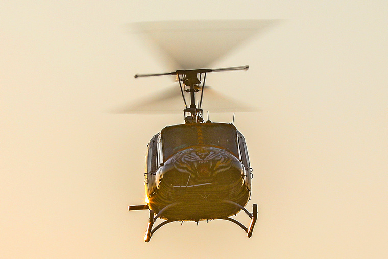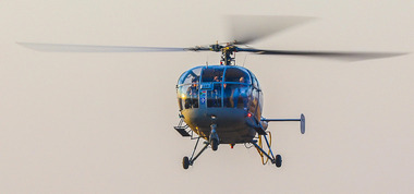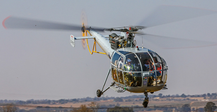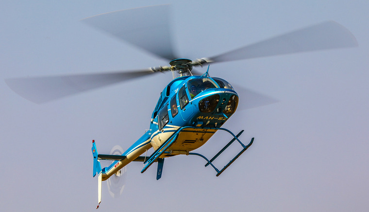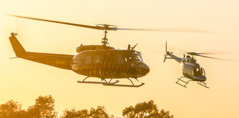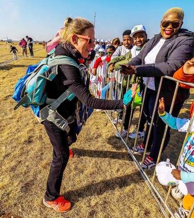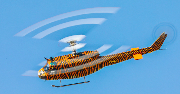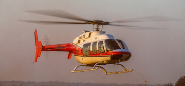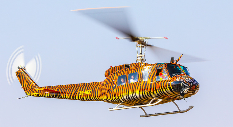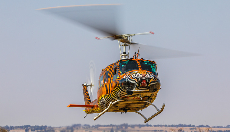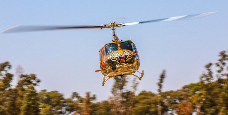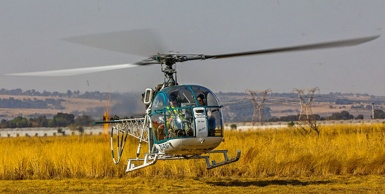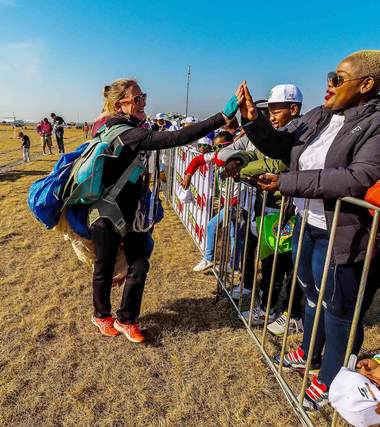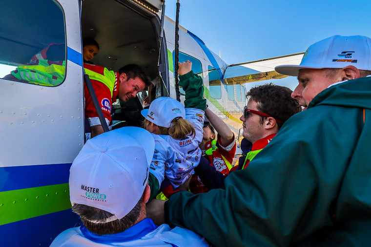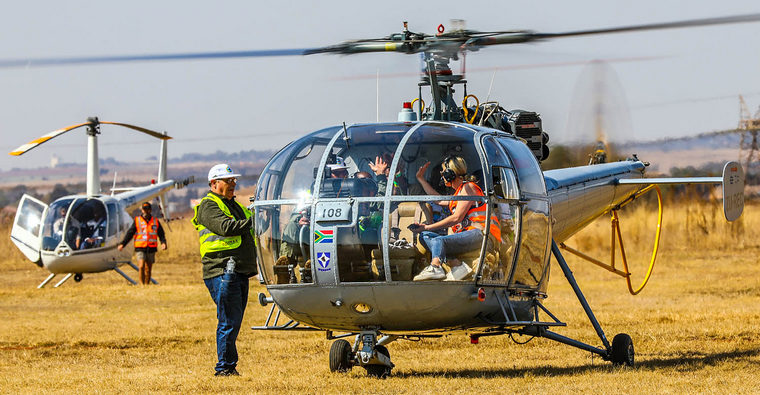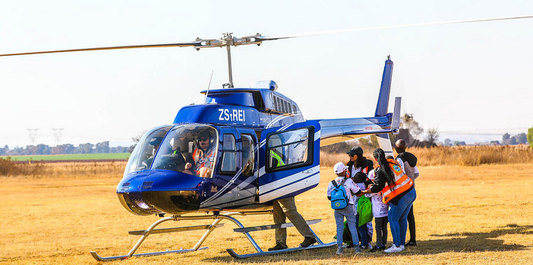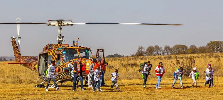 Michele Pretorius waves to the children as they taxi out, helicopter hot-turnaround in progress.