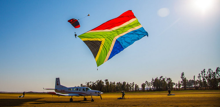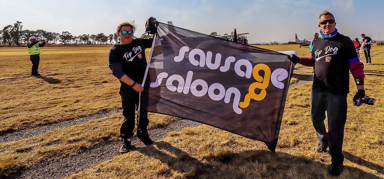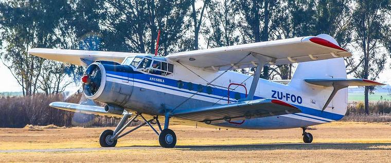 Heystek and Michele Pretorius in their AN-2 "Anushka" on take-off roll with Ralph Ridge and his parachute team for the opening.