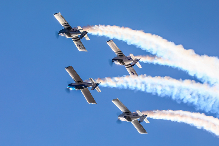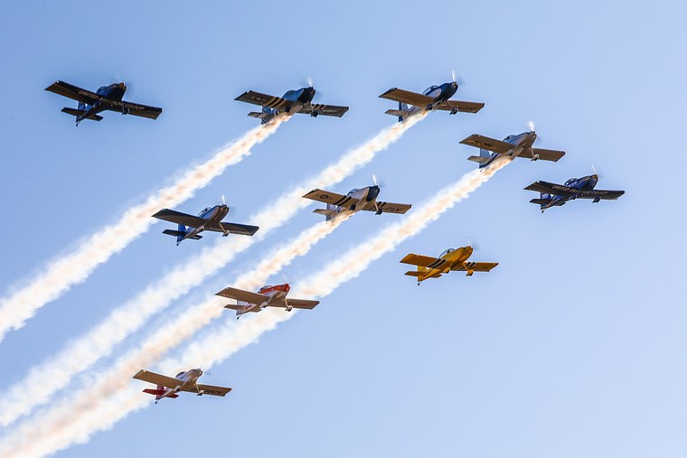 RV formation of 10 aircraft approach and break, whoops of amazement from the children!