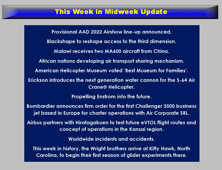 MIDWEEK UPDATE 15 SEPTEMBER 2022![]() ![]() ![]() ![]() ![]() ![]() ![]() ![]() ![]() ![]() ![]() ![]() PROVISIONAL AAD 2022 AIRSHOW LINE-UP ANNOUNCED defenceWeb ![]() The organisers of the Africa Aerospace and Defence (AAD) 2022 exhibition have released a tentative display line-up for the airshow on 24 and 25 September at Air Force Base Waterkloof. Some of the highlights include South African Air Force (SAAF) fast jets (Gripen and Hawk), a 'mini war' capability demonstration, Boeing 737 and L-100 formation, and a South African Police Service hostage rescue demonstration. The airshow will begin with a cavalcade of emergency services vehicles, and a flypast of powered paragliders and microlights. A SAAF Hawk will perform the official opening display. Numerous heritage and vintage aircraft are scheduled to take part, including Tiger Moths and SAAF Museum aircraft, which include the Bosbok, Harvard, Kudu, Cessna 185, Puma and Alouette II/III. Aerobatics of course feature strongly in this year's airshow line-up, with Zlin, Yak-52, L-39 and other solo displays, while aerobatic display teams taking part include the Raptors (flying Vans aircraft), Hired Gun (Pitts Specials), Goodyear Eagles (Pitts Specials), Puma Flying Lions (Harvards) and Iveco Extras (Extras). The South African National Defence Force will put on a 'mini war' display, while the South African Police Service will also do a hijacking/hostage rescue display - both typically involve aircraft, vehicles and simulated gunfire. Other demos include a Rocket HEMS emergency rescue demo, a mass parachute jump from a SAAF C-130 Hercules, and a South African Special Forces/Parabat display. Other SAAF participation includes a BK117 display, Silver Falcons team display, and a Gripen sunset display. Foreign participation so far confirmed includes a K-8 jet trainer display from Zimbabwe, and a UH-60 Black Hawk display from the United States Air Force. Zimbabwe will also have a C212 on static display while the United States will have C-17 Globemaster III, KC-135R, C-130J Super Hercules and MQ-9 Reaper aircraft on static display. ![]() Other items on the provisional line-up include motor gliders, gyrocopters, a L-29 solo display, Enstrom helicopter display, P-51 'Mustang Sally' solo display, Bell 222 display from Henley Air, and (on Sunday only) a formation of Safair Boeing 737 and L-100 Hercules aircraft. More aircraft are likely to be added to the display roster as the air show date approaches, and this is only a provisional list. In addition to the aerial action, the show features a mobility track demonstration area for vehicles, and a Youth Development Programme that will be staged in a dedicated Pavilion with a fun fly park. Tickets are available from Computicket. ![]() BLACKSHAPE TO RESHAPE ACCESS TO THE THIRD DIMENSION ![]() The Bk160-TR is a key part of Blackshape's vision to grant access to the third dimension for a larger customer base, including recreational flights for non-pilots, with an inclusive, unique and sustainable experience. "Aviation often suffers for being excessively conservative. The majority of training aircraft are about 50 years old, and even when there's access to a newer platform, the training philosophy remains outdated", says Luciano Belviso, CEO and founder of Blackshape. "In the past years we have worked hard to define a new path to introduce cadets to their careers with a broader, holistic approach. By focusing on their actual airmanship once they complete the training, rather than the number of hours they've flown - similar to military training organisations. After some proven experiences, including the Airline Pilot Program of Transavia Airlines, a subsidiary of KLM Royal Dutch Airlines, we have demonstrated that our vision is possible and by far more attractive for cadets, training organisations and operators. We concentrated all our philosophy into the Bk160-TR to set safer, less expensive and more effective training standards for operators, and give wings to an entire new generation of pilots. Blackshape is rapidly expanding its commercial presence over the world (18 countries and counting, in Europe, USA, Asia and Africa). ![]() defenceWeb ![]() The Malawi Defence Force has taken delivery of two MA600 transport aircraft from the China National Aero-Technology Import and Export Corporation (CATIC). The aircraft were readied for export in February this year, with Malawi's Ambassador to China, Allan Chintedza, taking part in the aircraft acceptance process. After a five-day flight from Kunming Changshui International Airport in China, the aircraft landed at Blantyre-Chileka International Airport on 18 July, where they were welcomed by Chinese and Malawian officials. One is painted in a civilian-style blue and white scheme, while the other features military-style grey paint. On receiving the two aircraft, Malawi's Principal Secretary in the Ministry of Defence, Erica Maganga, said the aircraft (MAF-T10 and MAF-T12) will be used to assist in transporting Malawian soldiers to peacekeeping missions as well as ferrying top government officials, including the President. This will cut costs considerably, as it will no longer be necessary to charter aircraft for these missions. Malawi Defence Force Deputy Commander, Lieutenant General Paul Valentino Phiri, said civilians would also be carried when the need arises. Malawian media report that the two aircraft were donated by the government of China. They provide a major boost to the Malawi Defence Force, as only helicopters (AS350B1, AS532L2 and SA330H) are currently in service with the Malawi Defence Force Air Wing. It used to operate a small number of fixed wing transports, like the Do 28, Do 228 and C-47 Dakota, but most of these are no longer in use. The MA600 is an improved version of the Xian MA60 with a new passenger cabin, new avionics system and Pratt & Whitney Canada PW127J turboprop engines developing more power. First rolled out in 2008, it has a 60-passeng