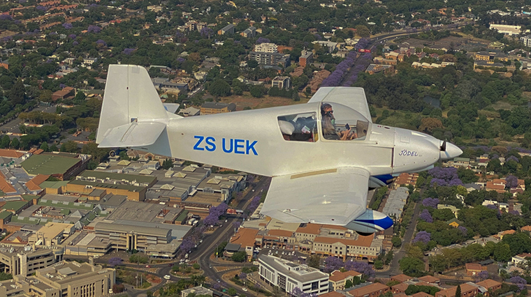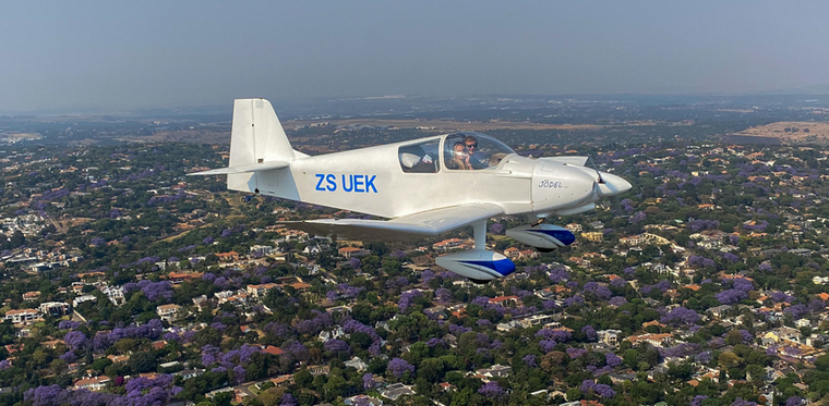 All pre-flight inspections complete and aircraft packed we lined up and took off from Fly-In for the short hop across the Pretoria CBD, towards Brits. The Jacaranda trees in full bloom provided a perfect backdrop for some air-to-air photography. Gregory Clegg brought his Jodel perfectly alongside however; it was a pity that my “short” lens was in for repairs I managed the following shots thanks to my cellphone.