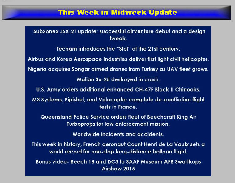 MIDWEEK UPDATE 13 OCTOBER 2022Google Banner Ad ![]() ![]() ![]() ![]() ![]() ![]() ![]() ![]() ![]() ![]() ![]() ![]() The long-anticipated Two-Seat SubSonex JSX-2T was unveiled at record-breaking EAA AirVenture Oshkosh 2022, providing the first opportunity for the public to see the new jet prototype. JSX-2T was first unveiled during the Sonex Open House and Homecoming Fly-In the day before AirVenture began and was then moved to the Sonex exhibit booth on AirVenture grounds where it was on display during the show. Sonex is in the process of lowering the turtledeck and aft canopy bow by approximately 3.5 inches. The forward canopy/windshield bow will be lowered approximately 2.2 inches to suit the aircraft's new lines while retaining a good forward sight line. This change will still fit our very tall and long-torso'd employee, James, who is 6'4" tall with only a 30" inseam. In addition to sleeker aesthetics for JSX-2T, the change will reduce structural weight for the airframe, helping us to meet our empty weight targets and will more importantly reduce frontal area and improve flow to the PBS TJ100 engine intake. While we're not changing any previously published performance estimates, these changes will help ensure that those estimates can be met or perhaps exceeded. As of this writing, progress in constructing the SubSonex JSX-2T prototype has taken a step backward to integrate this change. The original turtledeck, canopy and windshield have been removed from the aircraft, and the tail has been removed to access the aft-most fasteners in the turtledeck. Flat patterns for the new turtledeck formers have been cut and tooling for our hydro-press is in progress to form these parts, and the new turtledeck skins have been cut. We should have the new turtledeck back on the aircraft very soon and part files for new canopy bows are being sent to our machinist. Kitplanes editor and JSX-2 customer Paul Dye, while not especially tall, was absolutely swimming in the giant cockpit of the JSX-2T prototype at AirVenture, even with a 2" thick seat cushion. Sonex staff member Nathan is 6 foot, 2 inches tall with a 34 inch inseam and still has approximately 5.5 inches of clearance to the canopy. ![]() Another change vs. what was displayed at AirVenture 2022: The instrument panel and glare shield will get the rounded profile shown in JSX-2T CAD renderings, and the forward end of the glare shield will meet the bottom of the windshield similar to our B-Model aircraft. The faceted instrument panel and glare shield shape seen on JSX-2T at AirVenture was installed merely in the interest of time to get the jet ready to display at the show. ![]() Tecnam announced today the introduction of the new P2012 STOL dedicated to Short Take Off and Landing (STOL) operations, specifically designed to operate across the most demanding commercial airports in the world. Addressing the needs of a market niche that was left undeveloped and unsupported for decades, Tecnam is once again providing a solution to those operators that seek for their business a modern, spacious, comfortable, safe yet stylish aircraft, with outstanding STOL capabilities. The P2012 STOL is the only twin piston with Short Take-Off Landing capabilities compliant to the latest certification amendments. It offers a 3680 kg / 8113 lb Maximum Gross Weight, while guaranteeing a modern design, wide and comfortable cabin, and 11 seats. The interior accommodation is enhanced by a central aisle, a dedicated window for each of the 9 single passengers, no bench/double seats and the best passengers' amenities such as USB ports, cabin Air Conditioning, individual fresh and hot air outlets, dedicated reading light, seat pockets and cup-holders. The interior design and the superb view provided by the "high wing" configuration provide a "best-in-class" experience for the flights to typical "exotic" STOL destinations. Mission accomplishment and flight safety enhancement pass through a modern cockpit with latest technology, including state-of-the-art G1000 NXi avionic system and GFC700 specifically tuned autopilot. Active and connected flight deck (Bluetooth, flight stream, Iridium) and a toolbox of modern aids (Wx radar, storm scope, inset map, Synthetic Vision™) are provided to reduce workload and fatigue while increasing mission effectiveness. From a comfort perspective the P2012 STOL offers a +34% wider cabin, +24% larger seat pitch, +188% higher luggage weight allowance and +303% better luggage volume when compared to the most known British STOL aircraft, and does it all in accordance with the latest certification standards. Google Banner Ad From the performance perspective the P2012 STOL can easily and more comfortably carry an equivalent payload of the most known British STOL aircraft while matching its take-off and landing performances, moreover, the P2012 STOL can also outperform its useful load by 20% up to a remarkable value of 1284 kg / 2830 lb while performing a STOL mission. At Maximum Take-off Weight of 3680 kg / 8113 lb, the take-off run takes only 275 m / 900 ft and to clear the obstacle the take-off distance is achieved in just 425 m / 1395 ft. Even better at the 3630 Kg Maximum Landing Weight where the landing distance from the obstacle takes only 360 m / 1180 ft and the impressive ground run requires just 155 m / 510 ft. There are thousands of regional and local STOL airports around the world needing an outclassing airframe, superior performances, the latest safety and a 21st Century design, capable of lifting off from prepared and unprepared strips of less than 300 m / 1000 ft. The P2012 STOL, developed by the renowned and innovating Tecnam Research and Development team, is available in the passenger and multi-mission configurations (combi, cargo, air ambulance). Fully interchangeable, the 11-seat, twin-engine, fixed gear, unpressurized Tecnam can quickly and easily be converted from a 9-passenger carrier into a special-purpose aircraft… and back aga