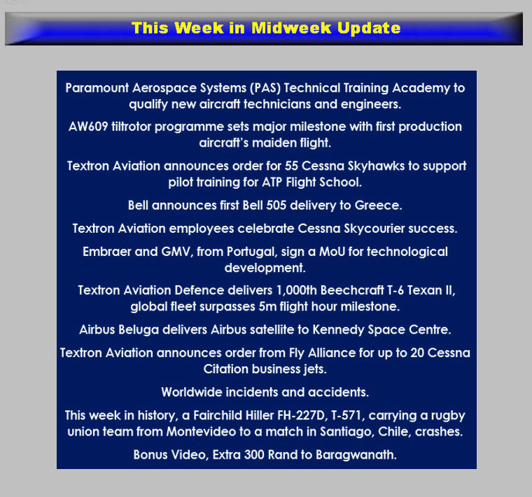 The 1,000th T-6 military flight trainer was delivered to the Colombian Air Force. The fleet of five T-6C Texan II trainers equip Air Combat Command No. 1 (CACOM-1) with its initial slate of Beechcraft T-6C Texan II advanced military training aircraft at the Capitan Germán Olano Moreno Air Base in Palanquero, Colombia.