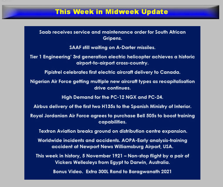 MIDWEEK UPDATE 9 NOVEMBER 2022Google Banner Ad ![]() ![]() ![]() ![]() ![]() ![]() ![]() ![]() SAAB RECEIVES SERVICE AND MAINTENANCE ORDER FOR SOUTH AFRICAN GRIPENS defenceWeb ![]() Saab has received a support contract for the service, repairs and maintenance of the South African Air Force´s Gripen C/D jet fighters. The order value is MSEK 333 (MZAR 532) over a three-year period. The contract runs for three years from 2022 until 2025 and covers service, repairs and maintenance as well as minor updates of the support and training systems of the South African Air Forces Gripen system. South Africa is operating Gripen C/D since 2008 and is Saab´s first export customer on Gripen. “I am very happy and satisfied that we have now reached an agreement for a new support contract, so that we in the very best way can support our customers with their operational needs,” says Åsa Schöllin, head of Saab´s business unit Gripen Sustainment. Gripen C-series is the most reliable swing-role combat aircraft available in the world today. Over 150 million people in five countries on three continents rely on Gripen C-series to protect their sovereign air space and ensuring their independence. Gripen C/D has successfully participated in Nato-led as well as numerous exercises and air policing assignments across the world. ![]() Guy Martin defenceWeb ![]() The South African Air Force (SAAF) has only received a few practice A-Darter missiles from Denel Dynamics and will not be getting combat capable missiles any time soon due to the 'complete stop' of production at Denel Dynamics. The SAAF has only received eight inert practice missiles from Denel Dynamics and manufacture of the full complement of trainer and operational missiles is still outstanding. This is according to Defence and Military Veterans Minister Thandi Modise, who answered a written question posed by Democratic Alliance shadow defence minister Kobus Marais. He asked her what the status of the A-Darter missile is and if Denel Dynamics can deliver missiles to the SA Air Force. She replied that Denel was in March 2015 contracted to industrialise and manufacture the A-Darter fifth-generation air-to-air missile for the SAAF. All missiles were supposed to be delivered by October 2017, but development and qualification was only completed by November 2019. “Primarily due to reasons of liquidity and subsequent resignation of key personnel, execution of the programme came to a complete stop for the past three years,” Modise explained. ![]() She went on to state that “A new manufacturing baseline audit by Armscor indicates that sufficient production personnel are still employed by Denel to manufacture the required missiles. Denel has however lost most critical design expertise which is required to sign off on the missile subsections as designated Design Authorities. Denel also doesn't possess the technical expertise to render obsolescence engineering during production. “As a fall back plan, Armscor has developed a collaborative model by means of which missile sub-sections can be manufactured and signed off by other entities in the domestic defence industry that are currently employing the requisite experts previously responsible for development of the A-Darter missile. In terms of the proposed model, relevant missile subsections can be manufactured and signed off by appropriate entities in industry and Denel will assume responsibility for final integration of the subsections into the all-up missile. The proposed new approach and all associated implications, however, still need to be considered and sanctioned by the SAAF,” Modise concluded. The A-Darter was developed jointly with Brazil under Project Assegai, with Denel Dynamics to deliver eight practice missiles, 21 trainer missiles and 41 operational missiles to the SAAF. Continued delays mean the A-Darter, which should have been completed in 2015, is already seeing some obsolescence in certain areas. Limited re-engineering will be required before production can commence. In the meantime, the South African Air Force continues to use the interim IRIS-T missile, which was acquired from Germany in 2009. The A-Darter, under development since 2006, features a two-colour seeker and advanced decoy rejection software. Using the pilot's helmet sight, the A-Darter can engage targets off to the side of the launch aircraft and it can also be used in an “over the shoulder” mode, pulling extremely high Gs - more than 80 - to engage an aircraft that is behind the launching fighter. The missile has a range of around 20 km. The weapon is intended to arm the SAAF's Gripen C/Ds, ultimately replacing the interim IRIS-T short range infrared guided missile. Brazil intended to acquire A-Darters for its own Gripen E/F fighters. ![]() Since the retirement of the R-Darter, the SAAF does not have a beyond visual range air-to-air missile. This would have been addressed by the Denel Dynamics Marlin, which the company began testing in 2016. This new active radar-guided air-to-air missile will have a range of 100 km and will also be developed into an all-weather surface-to-air missile. However, with Denel's liquidity and capacity problems and the SANDF's declining budget, it is not clear how far this project will proceed. ![]() The flight from Jacqueline Cochran to Palm Springs equals the 21nm distance of the first commercial helicopter flight across the English Channel on 25 September 1947. The all-electric aircraft is a modified Robinson R44 helicopter flown by pilots Ric Webb of OC Helicopters and Martine Rothblatt of Lung Biotechnology. Glen Dromgoole, President of Tier 1 Engineering, said, “Progress in the development of all-electric propulsion is similar to other periods of significant advance in aviation. The first aircraft flew short distances, and many people were afraid to ride in the new flying machines. At the start of the Jet Age, there was widespread scepticism about the commercial viability of the tu