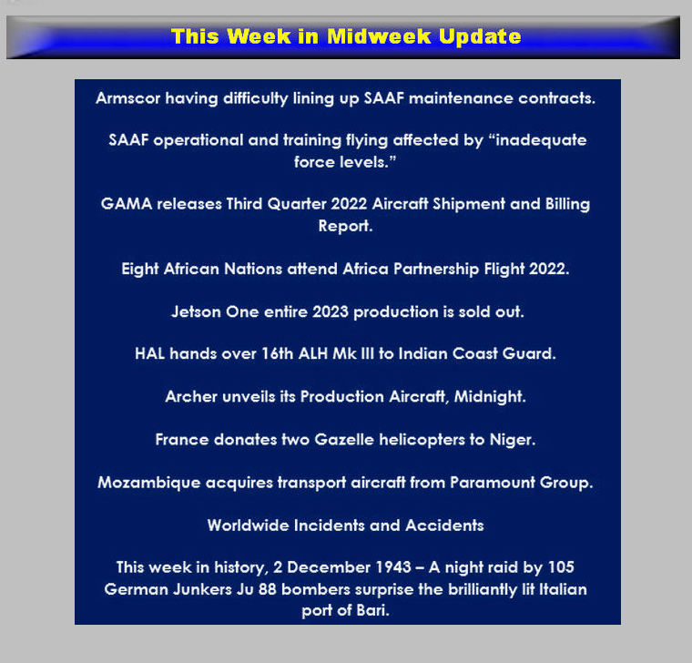 MIDWEEK UPDATE 23 NOVEMBER 2022Google Banner Ad ![]() ![]() ![]() ![]() ![]() ![]() Guy Martin www.defenceWeb.co.za ![]() As the Department of Defence's (DoD's) defence material acquisition agency, Armscor is trying to make sure that maintenance contracts are in place to keep the South African Air Force's (SAAF's) aircraft flying in spite of budgetary and other challenges. In a presentation to the Joint Standing Committee on Defence (JSCD) on 10 November, Armscor gave a presentation on its service level agreement with the DoD and this included the support contracts “funded from the limited SAAF operating budget.” Armscor noted that funds have to be prioritised for allocation to the respective aircraft fleets and funding challenges inevitably result in under-funded support contracts as well as delays in receiving funding for support contracts. “Funding limitations are resulting in challenges with negotiating support contracts with OEM's [original equipment manufacturers] that meet all SAAF requirements - this leads to delays in contract placement as well as periods with no support contracts for affected aircraft,” Armscor's presentation stated. In spite of these issues, Armscor is placing contracts to ensure airworthiness for much of the fleet. The Boeing Business Jet (BBJ), for example, has a contract that expires on 30 November and placement of a new contract is in process and this is expected to run from 1 December this year. The Falcon business jet fleet has no contract in place, as this expired on 1 July, but a new contract will be placed from 1 December. The King Air maintenance contract is in place until 15 February 2023, but a new contract offer solicitation is in process. For the transport fleet, the C-130BZ Hercules maintenance contract has been extended to 31 December and a new contract will be placed by 1 January 2023. A contract for the C212 fleet has been in place since August, while the C-47TP fleet, which has not had a contract since April 2017, will finally have a maintenance contract from 1 December this year. The Cessna 208 Caravan maintenance contract is valid until 15 December. On the rotary wing side, the Oryx support contract is valid until September 2023, as is the Rooivalk combat support helicopter contract. The BK 117 contract expired on 31 March this year and Armscor is “still awaiting requirement from the SAAF.” For A109 Light Utility Helicopter support, this contract is valid until 30 November and a new contract is in process for placement by 1 December. The Lynx maritime helicopter's support contract is valid until September 2023, but Armscor is in the process of contracting for long lead spares. After a year-long grounding, the SAAF's Gripen fleet returned to the air in time for the September 2022 edition of Africa Aerospace and Defence, as an airframe support contract is in place with Saab effective 1 September. Armscor aims to have an engine support contract in place with GKN by 1 December. The Hawk Mk 120 lead-in fighter-trainer is supported until 30 June 2024, while the PC-7 Mk II fleet is supported by the manufacturer Pilatus until 15 March next year. ![]() ![]() All told the airborne service of the SA National Defence Force (SANDF) planned to log 17 100 flying hours in the 2021/22 financial year according to the latest Department of Defence (DoD) annual report and fell just over 10% short of target across three named categories. By far the majority of these were set to be force training hours (12 100) with aircrews using all SAAF rotary and fixed wing aircraft ranging from trainers, in the form of PC-7 Mk11s and Hawk Mk120s through to Agusta A107 light utility, BK117, Oryx and Rooivalk combat support helicopters as well as C-208, PC-12, C-212 and C-130BZ transports. The Gripens of 2 Squadron at Air Force Base (AFB) Makhado were grounded due to a lack of funding and maintenance and support contracts not being renewed timeously. This was rectified early this September with the sharp end of SAAF making a welcome return to the skies and being seen at the Africa Aerospace and Defence (AAD) exhibition at AFB Waterkloof. ![]() The annual report does not give a breakdown of hours flown on type for the three categories of flying hours. They are 10 986 hours for force preparation, 3 410 for force employment against a target of four thousand and 818 VVIP (target one thousand). The report further notes: “Inadequate force levels of all aircraft systems continued to hamper the ability to fulfil required operational and training requirements. The reduced budget led to a decrease in force preparation hours and resulted in maintenance and servicing backlogs with less serviceable aircraft available”. ![]() ![]() The General Aviation Manufacturers Association (GAMA) published the Third Quarter 2022 General Aviation Aircraft Shipment and Billing Report. The aircraft manufacturing industry's results for the first nine months of 2022, when compared to the same period in 2021, point to increasing aircraft deliveries across all segments along with an increase in the overall value of the aircraft shipments. Aircraft shipments through the third quarter of 2022, when compared to the same period in 2021, saw piston airplane increase 8.8% with 1,012 units, turboprops increase 7.3% with 383 units and business jet shipments increase 1.8% with 446 units. The value of airplane deliveries through the third quarter of 2022 was $14.1 billion, an increase of approximately 4.8%. ![]() Helicopter shipments through the third quarter of 2022 were up when compared to the same period in 2021; piston helicopter deliveries increased 3.8% with 137 units and turbine helicopter deliveries increased 7.1% with 439 units. Nine Month Aircraft Shipments and Billings Aircraft Type 2021 2022 % Change Piston Airplane 930 1,012 8.8% Turboprops 357 383 7.3% Business Jets 438 446 1.8% Total Airplanes 1,725 1,841 6.7% Total Airplane Billings $13.5B $14.1B 4.8% Piston Helicopters 132 137 3.8% Tur