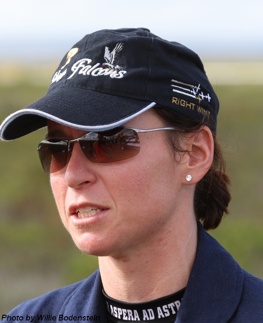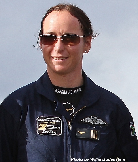 Major Heybrech Fredrika van Niekerk, 31 years old and is the first and currently the only woman to fly for the SAAF Silver Falcons formation aerobatic display team. Upon our introduction, I'm surprised at her small frame and femininity. She immediately weaves a spell on you with her kindness and excellent sense of humour. “I matriculated at Stellenberg High School but I attended seven schools during my school career. We constantly moved around South Africa due to my father's work. I failed Mathematics in Grade 10 and only just passed Science,” she admits.