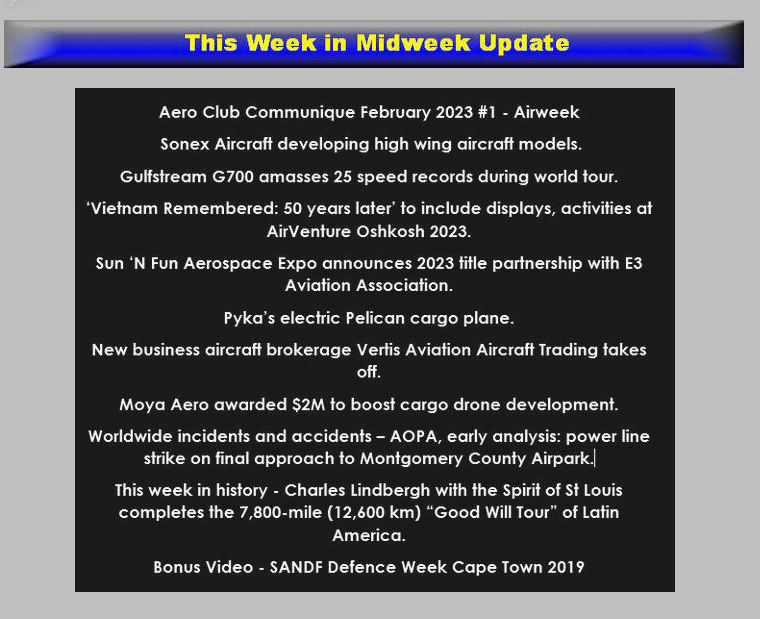Midweek Update 16 FEBRUARY 2023Compiled by Willie Bodenstein Google Banner Ad ![]() ![]() ![]() ![]() ![]() ![]() 21 to 23 Air Cargo Africa exhibition and conference Emperor's Palace, Johannesburg. Contact Priyo Patra: priyopatra@statmediagroup.com Website: www.aircargoafrica.aero 23 & 24 Public Safety and Security Drone Conference Emperors Palace Convention Centre. Contact Adelaide Maphosa E-mail: adelaide@africaaptraining.co.za 24 CAASA Annual General Meeting via Microsoft Teams. Contact Louise Olckers E-mail: gm@caasa.co.za. 25 EAA Chapter 322 Young Eagles Brakpan airfield. Contact Neil Bowden E-mail: airadventuresa@gmail.com 25 to 26 SAC Western Cape Regionals Stellenbosch airfield. Contact Annie Boon E-mail: chunge@mweb.co.za Cell 082 902 8614 ![]() ![]() 3 to 5 Aero Club Airweek Middleburg airfield. Contact Sandra Strydom sandra@aeroclub.org.za Tel: 011 082 1100 4 EAA Saturday Breakfast / Gathering 07h30 Middleburg airfield. Contact Neil Bowden E-mail: airadventuresa@gmail.com 5 Brakpan Aero Club Toyz for Boyz. Contact Clarissa E-mail: Clarissa@airborneaviation.co.za Cell: 074 113 2911 10 to 11 SAC Training Camp Kitty Hawk airfield. Contact Annie Boon E-mail: chunge@mweb.co.za Cell 082 902 8614 18 EAA CHAPTER 322 breakfast fly-in Jack Taylor airfield, Krugersdorp. Contact Neil Bowden E-mail: airadventuresa@gmail.com 18 Brakpan Aero Club Bona Bona fly away.Contact Clarissa E-mail: Clarissa@airborneaviation.co.za Cell: 074 113 2911 24 & 25 SAPFA Rally nationals at Brakpan airfield.Contact Leon Bouttell E-mail: Leon@lbaa.co.za Cell: 076 294 1363 28 March to 2 April SUN 'n FUN Aerospace Expo Lakeland Florida, USA.Website: www.flysnf.org ![]() ![]() EAA Chapter 322 breakfast gathering, boot sale and fly market EAA Auditorium. Contact Neil Bowden E-mail: airadventuresa@gmail.com 1 SAPFA Speed Rally - venue TBC. Contact David le Roux E-mail: david@pilotinsure.co.za Cell: 073 338 5200 1 Volksrust breakfast fly-in.Contact Steven Prinsloo E-mail: steven@razzoaviation.co.za Cell: 084 317 2915 Johan Geldenhuys Cell: 082 861 3499 / Cell: Thinus Kemp 063 201 9952 1 & 2 April SAC Training Camp Warmbaths / Bela-Bela airfield. Contact Annie Boon E-mail: chunge@mweb.co.za Cell 082 902 8614 15 EAA Chapter 322 breakfast fly-in Brits airfield.April Contact Neil Bowden E-mail: airadventuresa@gmail.com 15 Robertson annual fly-in and breakfast Robertson airfield. April Contact Alwyn du Plessis E-mail: boeredata@breede.co.za 15 to 16 SAC Eastern Cape Regionals Wings Park airfield. Contact Annie Boon E-mail: chunge@mweb.co.za Cell 082 902 8614 19 to 22 AERO Friedrichshafen Germany. Contact Tobias Brezel E-mail: tobias.bretzel@fairnamic.com Cell: +49 1752313422 22 Elders Flight Brakpan airfield.Contact Felix Gosher E-mail: felixgosher@gmail.com Cell: 086 191 4603 20 & 21 April Security Drone Conference Century City Conference Centre Cape Town. Contact Tawanda Mandaza E-mail: info@12stonereality.co.za Cell: 063 580 6400 27 April to 1 May EAA National Convention at Vryheid airfield. Contact Neil Bowden E-mail: airadventuresa@gmail.com ![]() ![]() AERO CLUB COMMUNIQUE FEBRUARY 2023 #1 - AIRWEEK This year's Airweek has now a month to go. Essentially the outline theme will follow the successful Airweeks held in 2021 & 2022, which is an event for all our recreational aviators. ![]() The dates are 3 - 5 March 2023, with early arrivals on the 2nd for those who wish to have an extended stay. Please visit the website for more details. www.aeroclub.org.za/airweek/ Registration is also open for attending - and those who plan to attend if you can register at this link https://forms.gle/Kw45CUKkbsGUY9jv9 Those who wish to camp and hire tents, the booking link is here https://forms.gle/kco5A9ENSBKcyyzH7 For Exhibitors wishing to book exhibition space, visit the website www.aeroclub.org.za/airweek-the-2023-edition-exhibitor-information/ for details and Exhibitor forms. If you have any queries or require information, please email rsvp@aeroclub.org.za - as well as to be contact for sponsorship / Donations which would be welcome. www.aeroclub.org.za/member-renewals-and-new-memberships ![]() SONEX AIRCRAFT DEVELOPING HIGH WINGAIRCRAFT MODELS Sonex will be presenting three new webinar presentations over the next three months, hosted by EAA! These new live webinars will cover topics including the upcoming Sonex High Wing aircraft design, Rotax engine installations in Sonex aircraft, and an overview of all Sonex and AeroConversions products. Webinars are live video broadcast presentations with an interactive interface allowing viewers to submit their questions to the presenter and get answers in real-time. The event will also be recorded and hosted by EAA as archived videos for viewing later if you miss any of the live presentations or would like to watch a presentation again. ![]() ![]() Gulfstream Aerospace Corp. today announced the all-new Gulfstream G700 achieved 25 speed records on the recently completed G700 world tour. Gulfstream flew two fully outfitted G700 production test aircraft to more than 20 countries across six continents to demonstrate the aircraft's performance capabilities and the flexibility and comfort of the most spacious cabin in the industry. "The G700 world tour was a tremendous success," said Mark Burns, president, Gulfstream. "We knew the aircraft would perform exceptionally well, and they exceeded even our own high expectations for both reliability and performance across a variety of routes. Showcasing the outfitted aircraft to our customers and prospects around the world bolstered the already strong demand we are seeing for the G700." Notable record runs achieved by the G700 include: • Savannah to Riyadh, Saudi Arabia, in 12 hours, 36 minutes at an average speed of Mach 0.90 to begin the international portion of the tour • Istanbul, Turkey, to Van Don International Airport in Vietnam, in 9 hours, 2 minutes at an average speed of Mach 0.90 • Riyadh to Melbourne, Australia, in 13 hours, 39 minutes 
