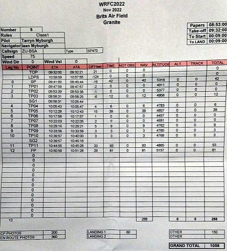 The landing score of 60 is exactly what I hoped for. Of our total 288 penalty points for navigation over the route, 174 points were scored in the last two legs. It is not a fantastic score but considering the wind, we are satisfied. Our score places us 25th overall, and 8th of the South African Teams. The margins are small, and we are only 100 points behind Marco and Leon in 22nd place. On to tomorrow….