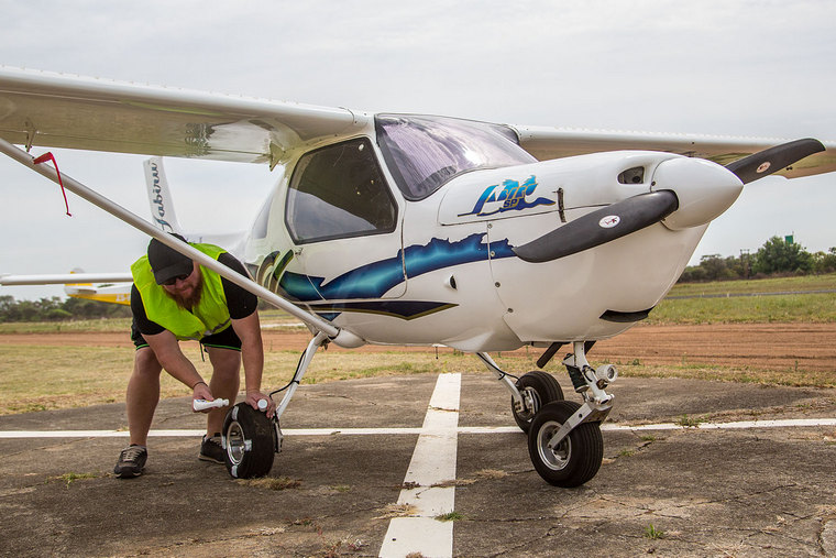Marshals, having already set out the landing area near the runway threshold, mark aircraft wheels to detect rolling movement more easily.