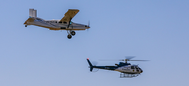 SAPS demonstrated a crime scene situation. First the Squirrel got airborne to join the Porter on air patrol. The aircrew members involved here were Rob Siegrest and Tillane Neethling piloting the Porter and Squirrel respectively. Then the call for assistance was received, while ground members set up a roadblock to stop the hi-jacked vehicle. The Squirrel came in with the dog handler and apprehended the suspect, much to the delight of the crowd. All the while Capital Sounds had Elvis giving high-energy commentary, rounded off with the sound track of Squad Cars, and SAPS got their man!