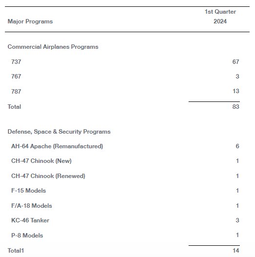 The Boeing Company [NYSE: BA] announced today major program deliveries across its commercial and defense operations for the first quarter of 2024.