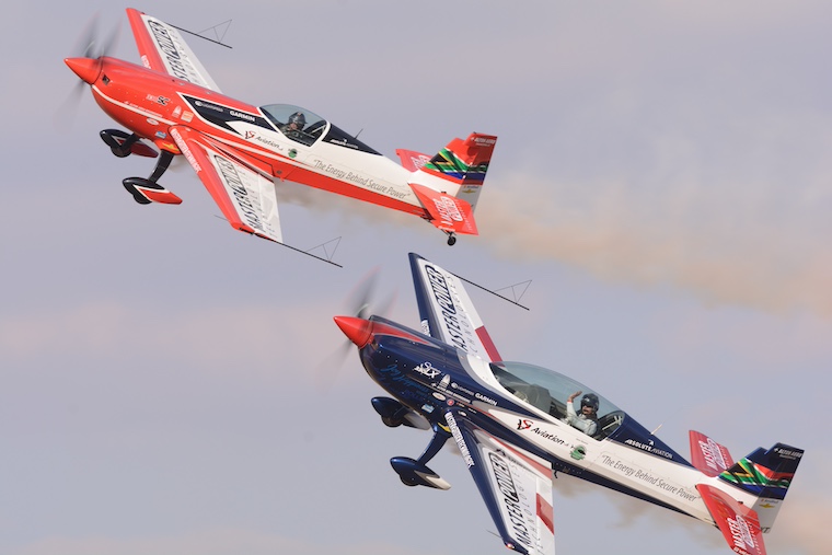 The team, consisting of Nigel Hopkins (Lead) Extra 330SC and Jason Beamish (N0.2) Extra 330LX, have been flying together for many years and has displayed all over the world. The two fly high energy aerobatics as a team and also as solo display pilots. The team is being sponsored by Master Power Technologies.