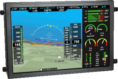 A fast multicore processor supports 3D terrain, multiple maps (Southern Africa is preloaded), ADS-B In and radio support, check list, video input, flight planning, automatic log book, warnings connected to your audio system, engine cool and shutdown assistance, maintenance warning and personalised layout for engine display. Master and Slave units are available, as well as independent combination backup instruments and PFDs.