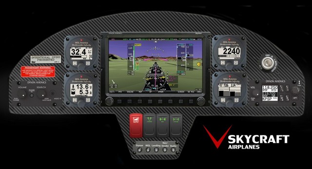 The instrument panel on SkyCraft's SD-1 Minisport is fully equipped with top-of-the-line technology. The panel's 7? Dynon SkyView Glass Display provides GPS, Synthetic Flight, and Collision Avoidance. The fuel management system uses electronic sensors that measure fuel flow into the engine, ensuring a precise reading which cannot be achieved with conventional float gauges. A Dynon COM Radio is standard in each aircraft with 2 channel monitoring and GPS-based frequency that automatically dials into the nearest airport's frequency. An auxiliary port is included so you can listen to your iPod without interfering with radio communications. The tachometer, heat gauges, and power management systems are all equipped with audio warnings whenever operation levels are unsafe. All of the instruments are lighted for night-time flying.
