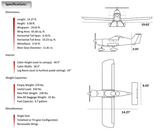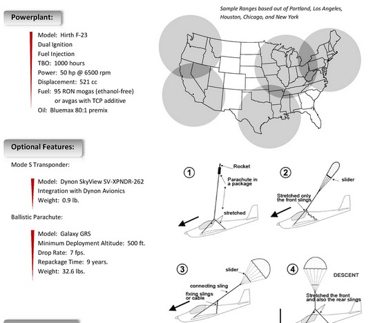 The safety features on the SD-1 make it reasonable choice for pilots of all experience levels. The fuel injected engine drastically reduces the possibility of engine icing, which is the leading cause of engine failure in general aviation. The dihedral wings provide positive stability control, making for a forgiving flight experience suitable for beginner pilots. Our Dynon system is backed up with a two hour power supply, ensuring the availability of instruments in the event of an electrical failure. An Emergency Locator Transmitter is hard-mounted inside of the plane, and will automatically relay your location along with a distress signal in the event of an accident. The optional ballistic parachute can be pulled anywhere above an altitude of 500 feet, and will gently drop the airplane level with the ground at 7 feet/second.