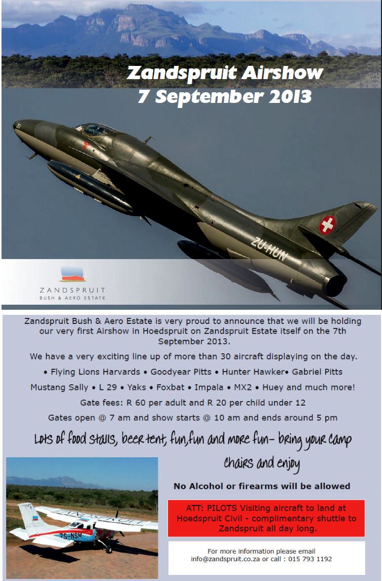 7 September: Zandspruit Bush and Aero Estate airshow - Hoedspruit . Contact Martin den Dunnen 015 793 1192 info@zandspruit.co.za