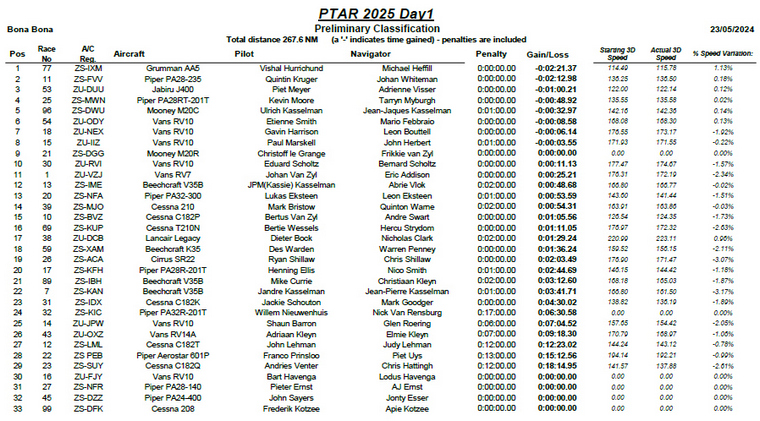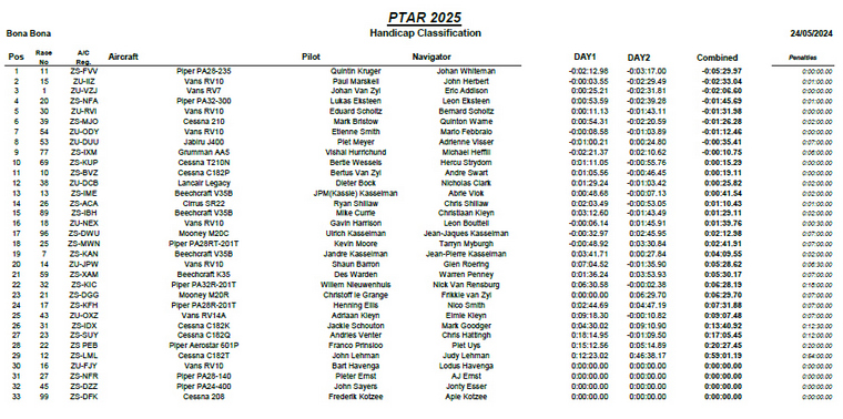 Scoring for Day 1 was a challenge as many of the loggers produced the tracks in a series of numerous parts rather than one continuous file. It took the scoring team many hours of hard work, but late in the evening, they were able to produce the Day 1 results. The logger equipment is getting older, and SA Power Flying has made a substantial investment in new Live Track equipment, bringing our tally from 9 to 25 live track loggers. These loggers also allow friends, family and spectators on the ground to get more involved as they can watch crews fly the route from anywhere. The new loggers were unfortunately delayed by customs and arrived a day too late for this event but will be ready for future events including next years President's Trophy.