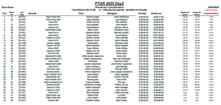 Unfortunately, a few unlucky teams had to withdraw in the week leading up to the event, resulting in a total of 33 entries for 2025. This year's event attracted aviators from across the country with entries from Gauteng, North West, Western Cape, Limpopo, Mpumalanga, KZN and Free State. This year attracted many new teams with 11 first time pilots and 10 first time navigators, of which 5 crews consisted completely of first timers. An impressive twelve pilots and navigators have completed more than 10 events, with one stalwart completing more than 30 events. It is clearly an event not to be missed that brings crews back year after year to try their luck and improve their results.