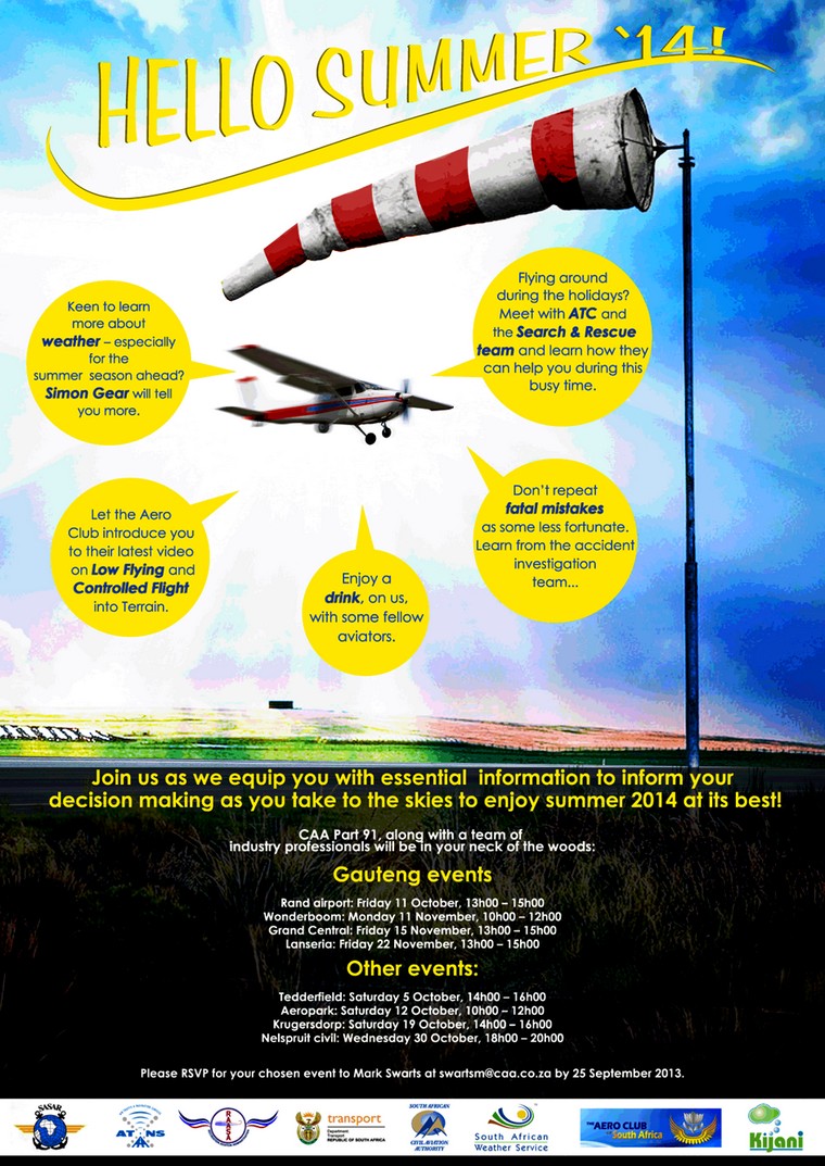2 November: Aero Club of South Africa annual awards ceremony at the Wanderers Club. Contact Sandra Strydom 011 082 1100 e-mail: membership@aeroclub.org.za