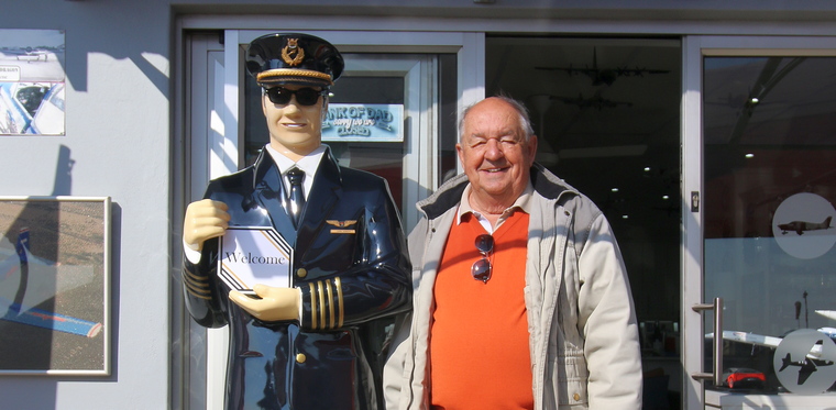 Captain Karl Jensen standing next to an effigy of himself when he was in the prime of his life flying 707 and 747's and other heavy metal. Down to its name plate it welcomes visitors to Gordon's man cave