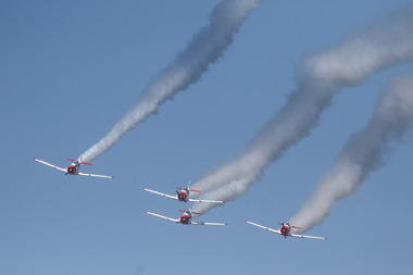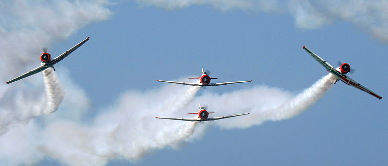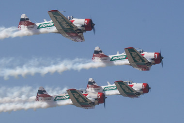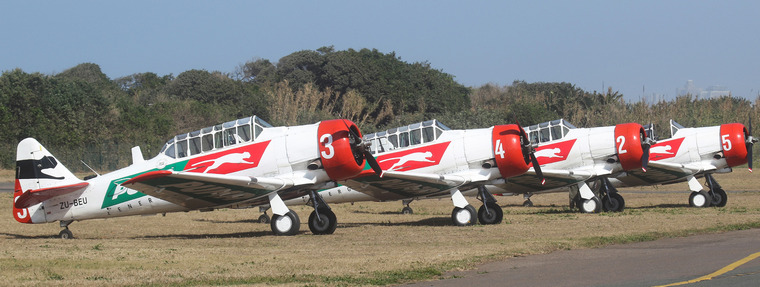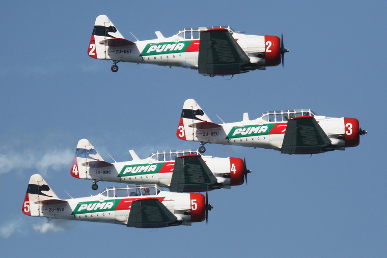 Next up were airshow staples, the Puma Flying Lions in their North America Harvards or Texans as they are known in the United States (ZU-BEU, ZU-BET, ZU-BMC, ZU-BVK). The team comprised Ellis Levin, Arnie Meneghelli, Dion Raath and Andrew Blackwood-Murray. The iconic growling radial engines powered yet another display of precision formation aerobatics.