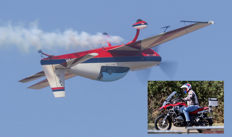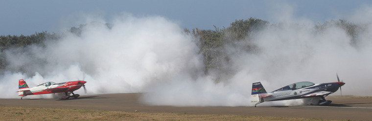 Then there was another unusual event. When it was announced the spectators became very interested and many pushed forward for a better view. This was a plane versus motorcycle race. The aircraft was an Extra EA-300L (ZS-DCR), flown by aerobatic champion Elton Bondi and the motorcycle was ridden by Lyle Blakeway. The result was unimportant but it demonstrated the speed and handling of two very different sporting machines. Elton then flew his solo display in the Extra showing off his aerobatic prowess.