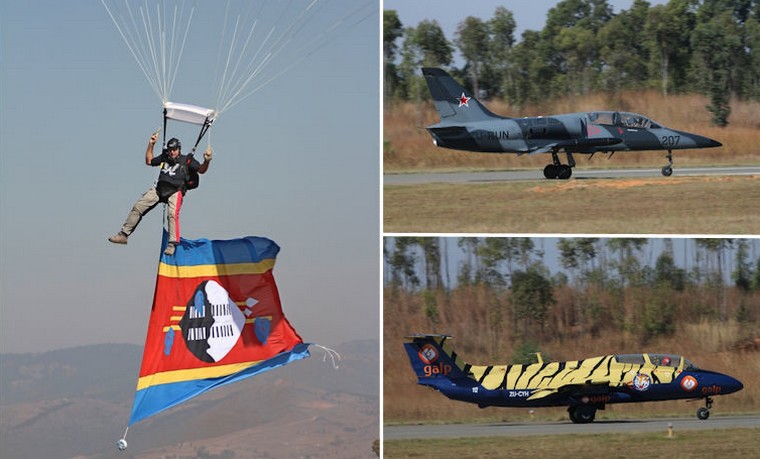 Two Atlas Angels were kept busy dropping eleven skydivers from Gauteng and KwaZulu Natal. The Skydivers has always been a crowd favourite with the Swazis. The event also marked the first display at a show by the Atlas Angel flown by Llewllyn Stroebel. Following the Angel was a brief display by Dave Gous in the Yak 52. Dave later treated the crowd to his “by now” famous Monkey act. The L39 and L29 belonging to Swazi resident Ernest Da Cruz and flown by himself and Mike Weingaartz then took to the skies in the first of their displays.