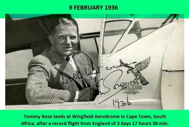 He became a national hero in March 1936 after his flight to Cape Town and back; "he can now claim to have made the fastest time for the trip both out and home. His new record is 6 days 6 hr. 57 min. (he got to the Cape in 89 hr. 37 min.), which beats F/O David Llewellyn's time-the previous best-by 5 hr. 6 min."