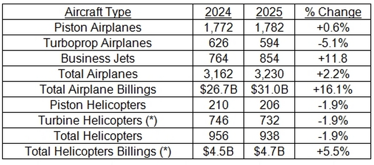 The General Aviation Manufacturers Association (GAMA) released the 2025 General Aviation Aircraft Shipment and Billing Report during its annual State of the Industry Press Conference. Overall, when compared to 2024, the business jet and piston airplane segments saw increases in shipments and preliminary aircraft deliveries were valued at $35.7 billion, an increase of 14.6%.