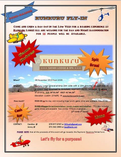 13 October: Charity Fly in. Jupiter Airfield. Contact: Daleen Grundlingh: SAVA CVC Coordinator. Tel: 012 346 1150, E-mail: cvc@sava.co.za