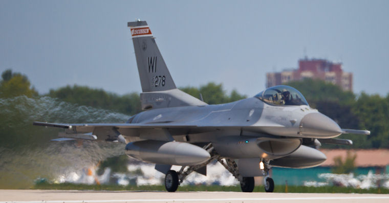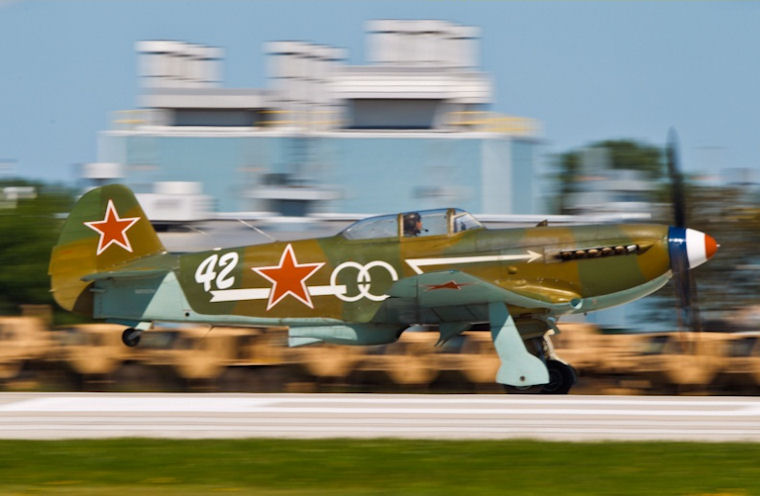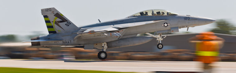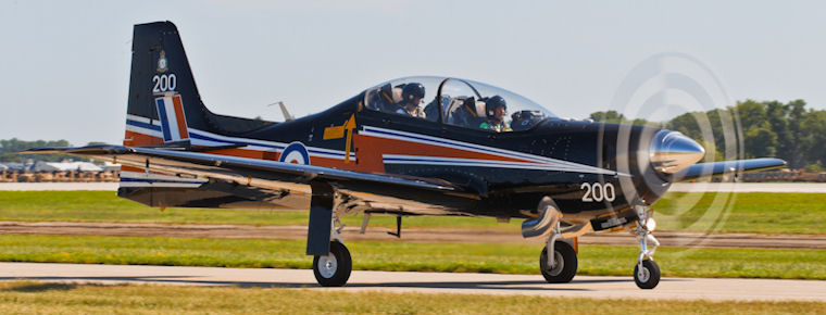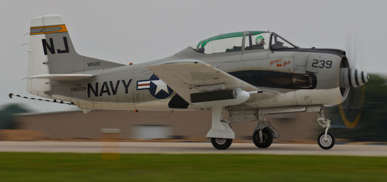 Those are probably the most important two words on this page. The more smoothly you pan, keeping the aeroplane in one place in the frame as it flies, instead of wobbling all over the place as you struggle to keep up with its motion, the more sharply it will be focused, the less camera shake there will be and the more deliberately your shot will be composed. Keeping up with a quick-moving subject by panning well is definitely the most important skill when it comes to shooting airplanes. The following picture was taken at Oshkosh 2011 and is an example of a panning shot at 1/125th; f13 with a Canon EF 400mm f4 DO IS USM and a Canon 1D MkIV.
