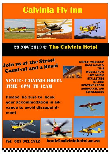 29 to 30 November: Calvinia. We want the pilots to come in, spend the day at the carnival, have a braai at the Hotel and leave the next day (the braai will be included in the accommodation cost). The purpose is to get to know the pilots from surrounding areas build relationships and plan an event for next year that will be more elaborate and will include flips and demonstrations. Contact: Pierre Ferreira Tel: 027-341 1512 E-Mail: book@calviniahotel.co.za