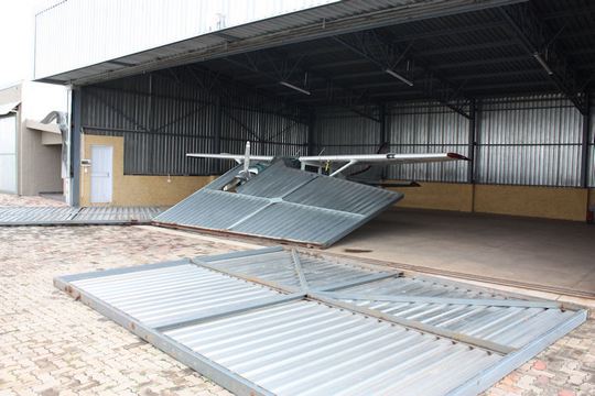 On Saturday 30 November all hell broke loose when, what appears to be, a tornado touched down at the Jack Taylor airfield in Krugersdorp. A narrow path of destruction could be seen starting in Krugersdorp Wes, all the way through to the airfield. Only the hangars in the south eastern side of the field were affected and the rest of the airfield shows absolutely no sign of any adverse weather. Debris from neighbouring factories also blew over the fences on to the airfield indicating the force of the wind. Although the local weather monitoring station was outside the path of the destruction, it still indicated a wind speed of 97kph.