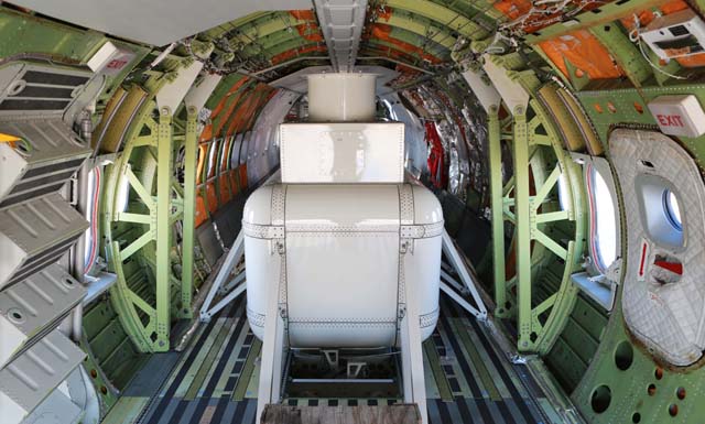 In the trials the aircraft carried one 3,500 litre tank and the water was gravity-ejected through two dispensers in the belly. The planned configuration would offer double that capacity with two 3,500 litre tanks being deployed using a roll-on/roll-off system which would permit the aircraft to be used for transport purposes when not required for fire fighting duties - greatly increasing its cost-effectiveness.