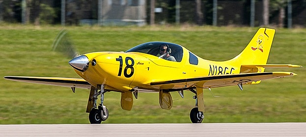 Rob Logan of Pepper Pike, Ohio, takes off in the AirVenture Cup Race in his Lancair Legacy. Photo by Geoff Sobering/Moving-Target-Photos.com