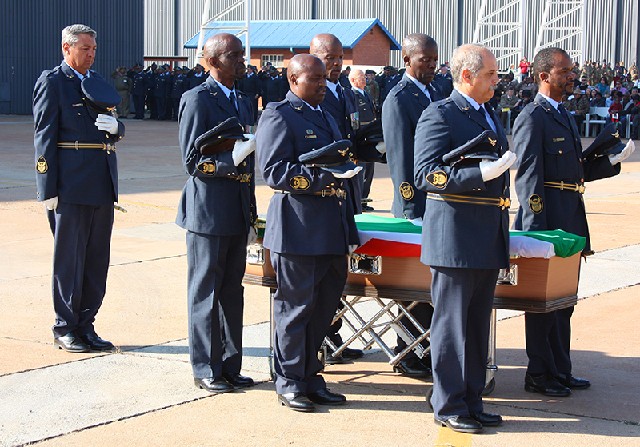 The families and invited guests were invited to attend the "Handing over of the Mortal Remains" parade. The three flagged draped coffins were "slow marched" to awaiting hearses accompanied by the SAAF Band. Members of 41 Squadron paid their respects by performing a missing man formation fly past in four Cessna Caravans.
