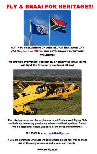 27 September: Stellenbosch Fly and Braai. For more info phone 021 880 0294 or E-mail accounts@stelfly.co.za