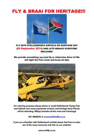 27 September: Stellenbosch Fly and Braai. For more info phone 021 880 0294 or E-mail accounts@stelfly.co.za