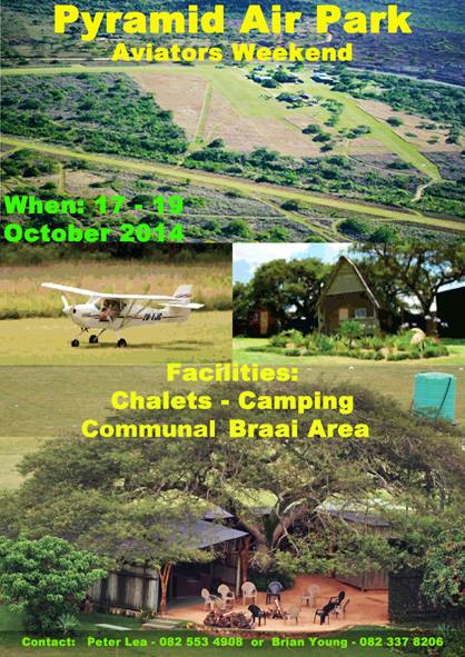 17 - 19 October: Pyramid Air Park Aviators Weekend Contact Brian Young Cell: 082 932 9397 or Peter Lea Cell: 082 553 4908 E-mail: plea1949@mweb.co.za