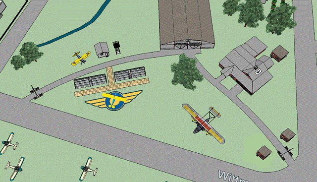 Artist drawing of overall Vintage expanded Vintage Plaza. Showplane Registration has been relocated more centrally near the tram stop and Aircraft Repair. The restaurant is being moved south to the former location of Showplane Registration.