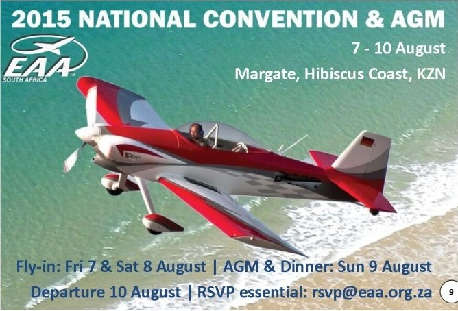 7-10 August: EAA National Convention & AGM. Margate Airport. RSVP at: rsvp@eaa.org.co.za